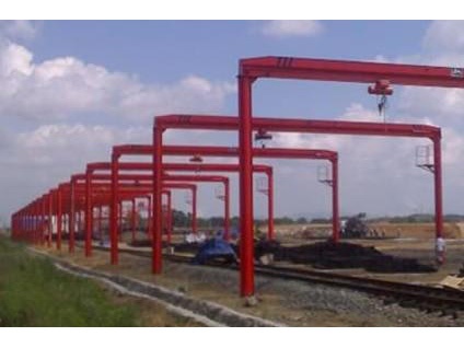 門式起重機(jī)是橋式起重機(jī)的一種變形。在港口,主要用于室外的貨場、料場貨、散貨的裝卸作業(yè)。它的金屬結(jié)構(gòu)像門形框架,承載主梁下安裝兩條支腳,可以直接在地面的軌道上行走,主梁兩端可以具有外伸懸臂梁。門式起重機(jī)具有場地利用率高、作業(yè)范圍大、適應(yīng)面廣、通用性強(qiáng)等特點(diǎn),在港口貨場得到廣泛使用。